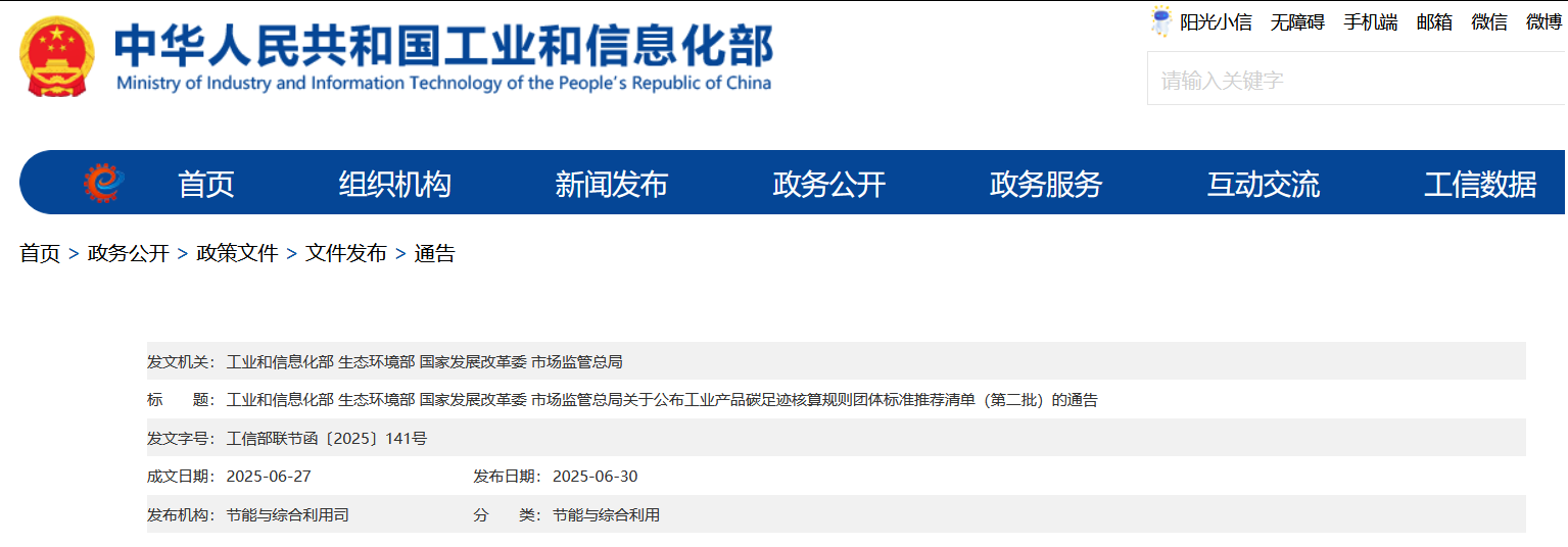 工業(yè)和信息化部等四部門關(guān)于公布工業(yè)產(chǎn)品碳足跡核算規(guī)則團體標(biāo)準(zhǔn)推薦清單(第二批)的通告